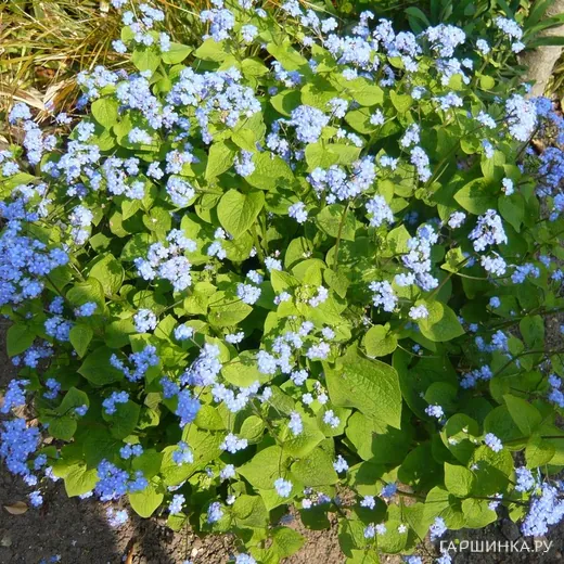 Бруннера крупнолистная - очень обильно цветущая компактная бруннера. Цветет в конце апреля-начале мая изящными голубыми цветками, декоративна на протяжении всего вегетационного периода. Листья сердцевидные, зеленые, однотонные . На одном месте может произрастать до 15 лет. Сорт зимостоек, выдерживает морозы до -29 °C.