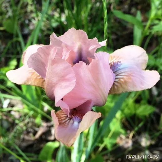 Ирис карликовый Волтс - красивоцветущее, многолетнее растение. Компактный куст до 35-40 см. Цветение обильное и продолжительное. На цветоносе может распуститься более 4 цветков. Размер цветка 6-7 см. Окраска жемчужно-розовая, более насыщенная в центре, с коричневыми тонкими прожилками. Бородка сине-голубая, выделяющаяся на общем фоне. Листья прикорневые, широколинейные, сизоватые. Зимостойкое, засухоустойчивое растение.